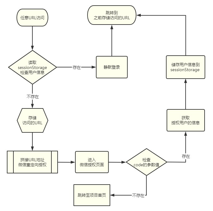 无论从打开的URL是哪一个路径下进行访问的,都会优先触发router.beforeEach生命周期钩子函数,在router.beforeEach中判断用户信息,依据是否存在用户信息来判断是否进行微信授权。然后将微信授权的信息存储在了sessionStorage中。
